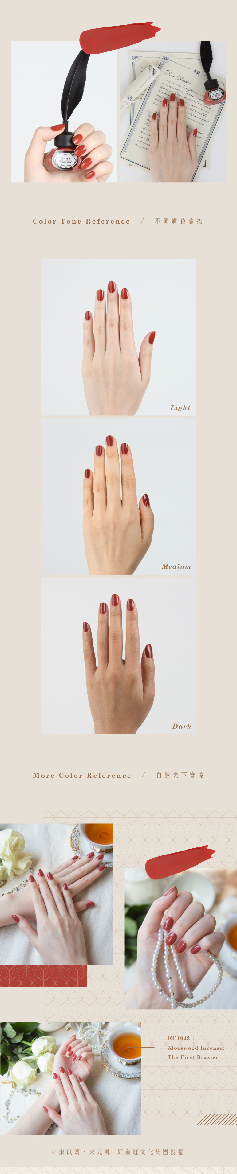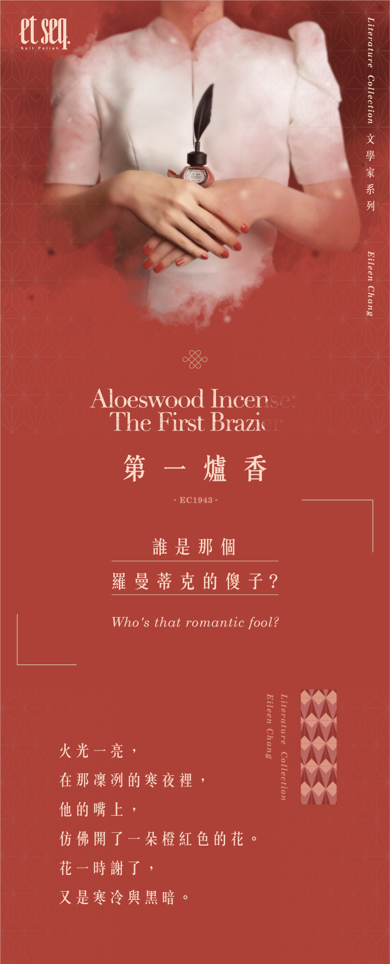 艷橘的紅,看似艷卻充滿朝氣,如同野放的花綻放在妳的指尖,努力宣示著自己的色彩,徑直往自己追求的方向,不後悔的奔跑。