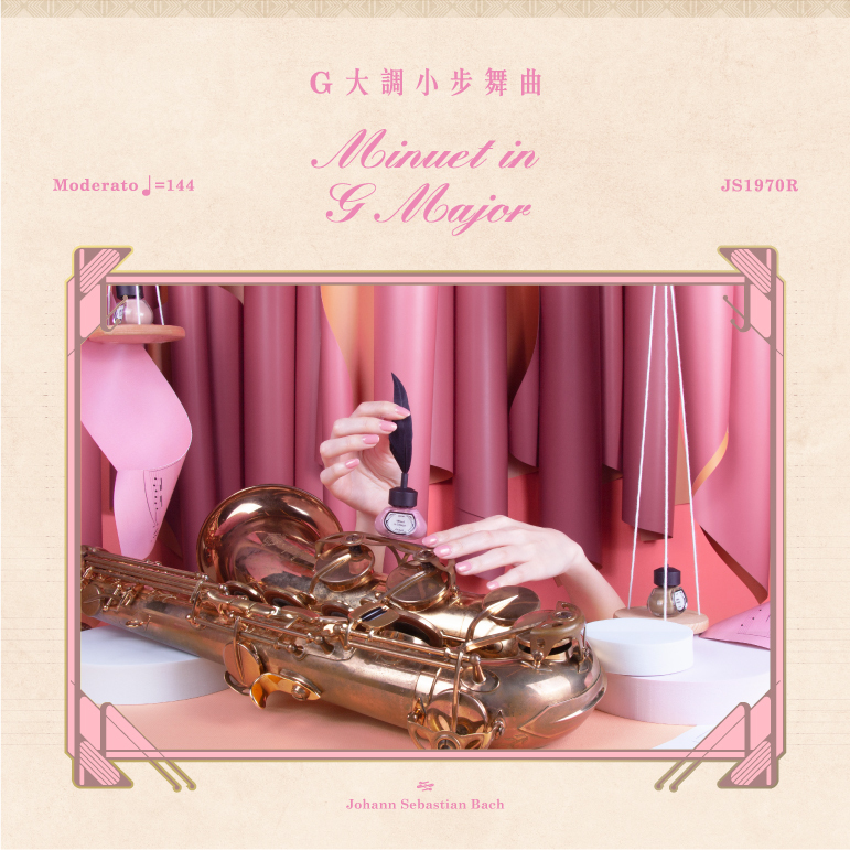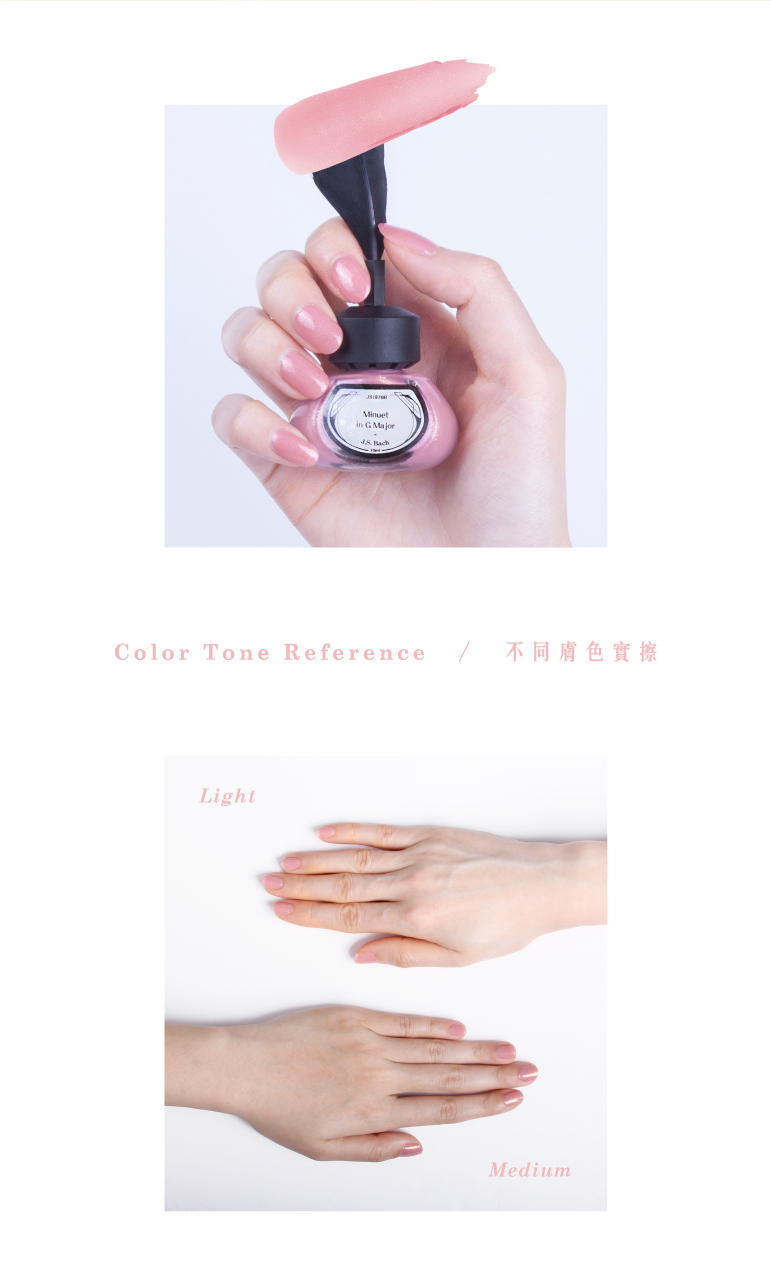 G大調小步舞曲給人輕巧明快的印象,指彩使用璀璨流金沙的質地,再搭配蜜桃粉的底色,表達樂曲裡那份輕快鮮明的形象。