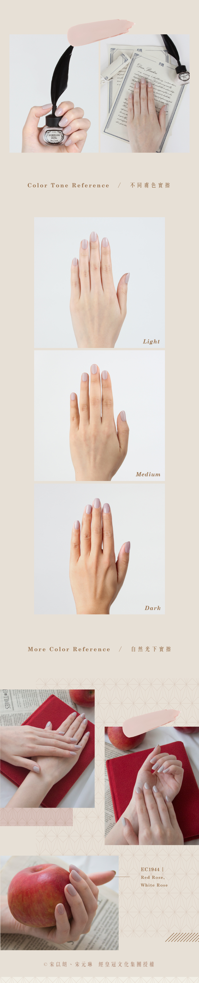 白色純潔無垢,有時卻讓人覺得扎眼,而冷調的藕色,卻像是調和了那份不適感般的存在,讓指尖綻放初心的同時又保有自我的理性。