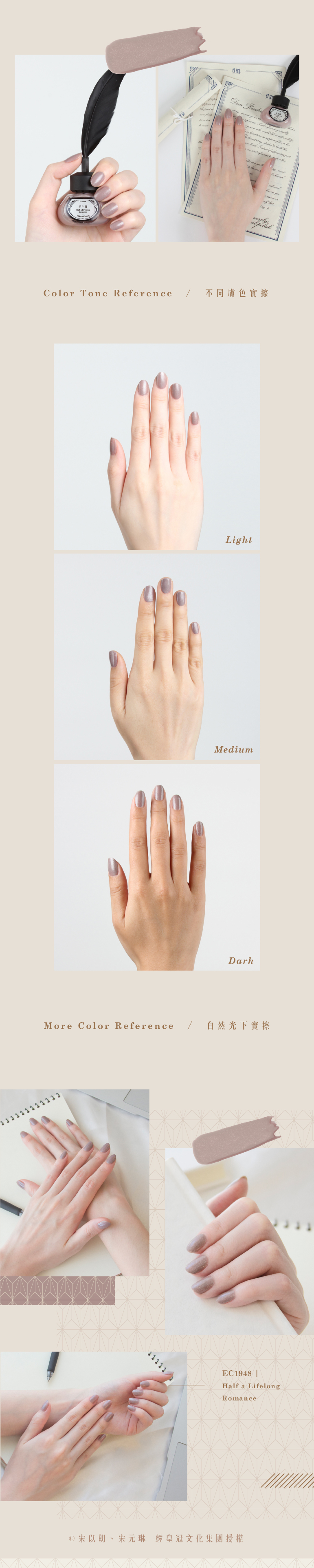 不飽和的冷調藕,是若即若離的緣分,耀閃在指甲上的光彩,則是屬於妳的那些回憶,讓這系列唯一的特殊質地帶妳重溫只屬於妳的故事,錯過的或許就錯過了,但美好的就讓它保持美好。