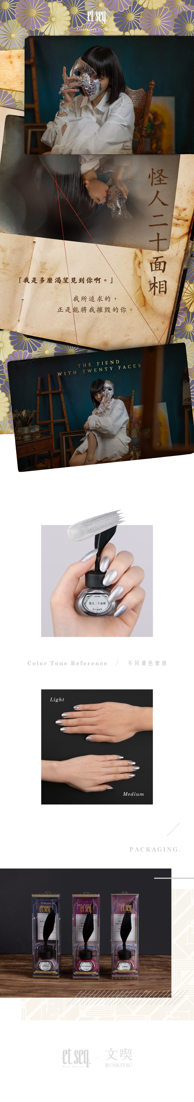 銀色象徵著無形與變幻,正如怪人二十面相的多重面貌,難以捉摸且充滿不確定性。這種金屬般的色澤,象徵著他如同鋼鐵般堅不可摧的意志與冷酷無情的犯罪本性,而銀色的反光特性則呼應了他在變化中的隱匿與逃脫,無論是在夜晚的陰影中,還是在眾人眼前變換身份時,都無時無刻不在映照著他難以被揭露的真實面貌。