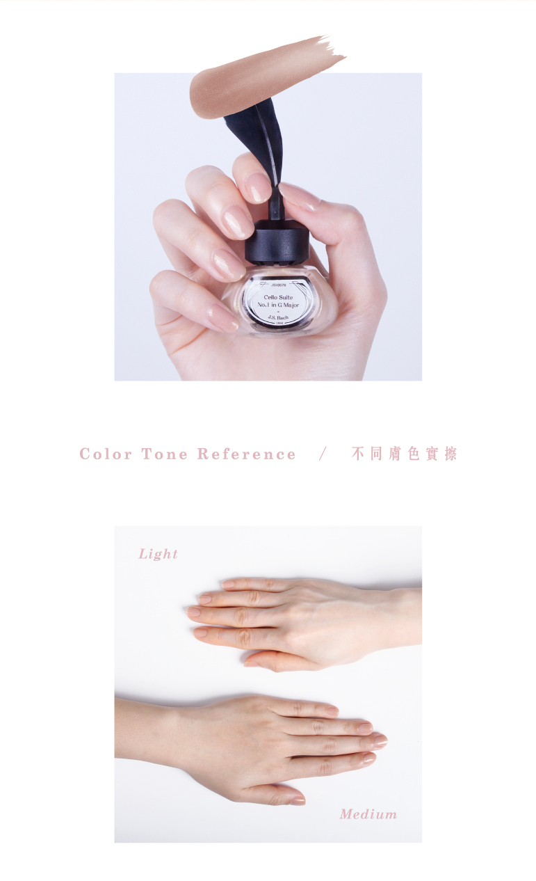 G大調第一號大提琴組曲給人明亮的印象,所以指彩透過璀璨流金沙的質地,搭配裸膚粉色的底色,表達出樂曲裡的那份明亮輕快美感。