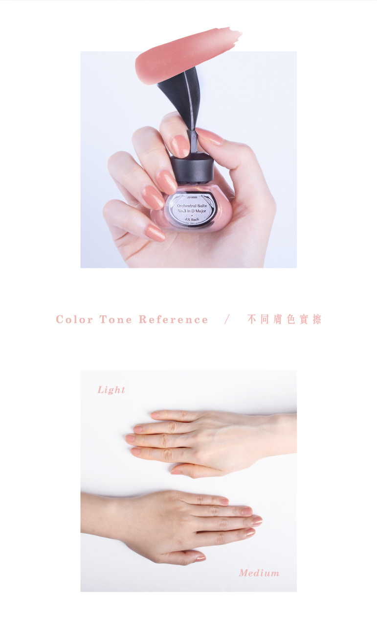 D大調第三號管弦樂組曲給人莊重典雅的印象,指彩使用璀璨流金沙的質地,再搭配玫瑰粉的底色,表現出樂曲裡的那份優雅典美。