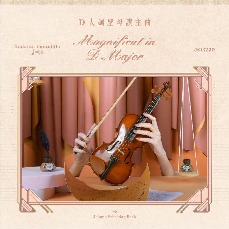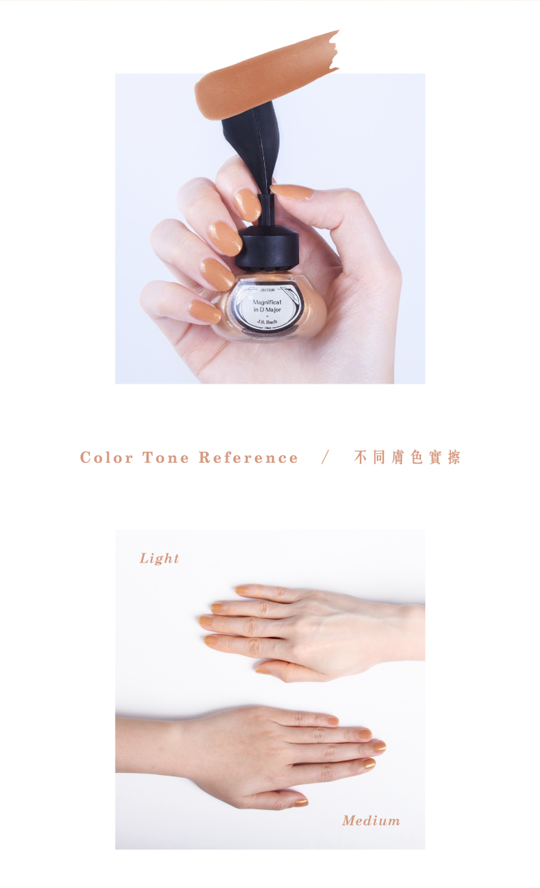 D大調聖母讚主曲給人神聖且喜樂的印象,指彩使用璀璨流金沙的質地,再搭配暖陽橙色的底色,展現樂曲裡那份溫暖且聖潔的形象。
