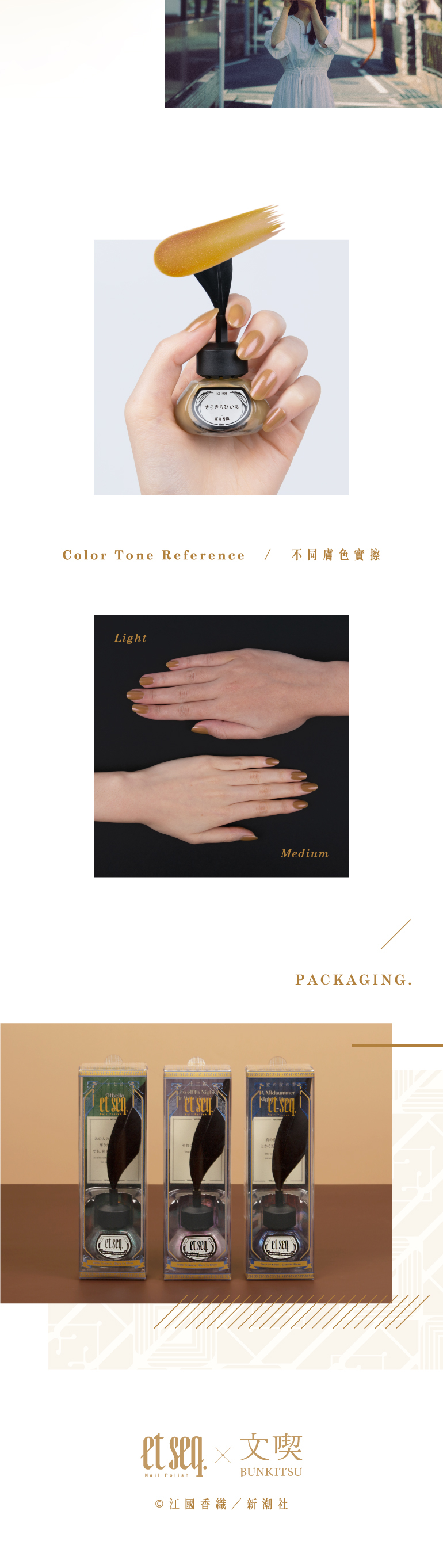 指彩的本色辛螺色是形容貝殼內側面那帶著微粉感的黃色,而為了強調每個陷入愛情裡的人們那微小而努力燃燒自己的形象,更額外添加了粉色偏光,讓指彩隱隱約約間閃爍璀璨,愛得閃閃發亮。