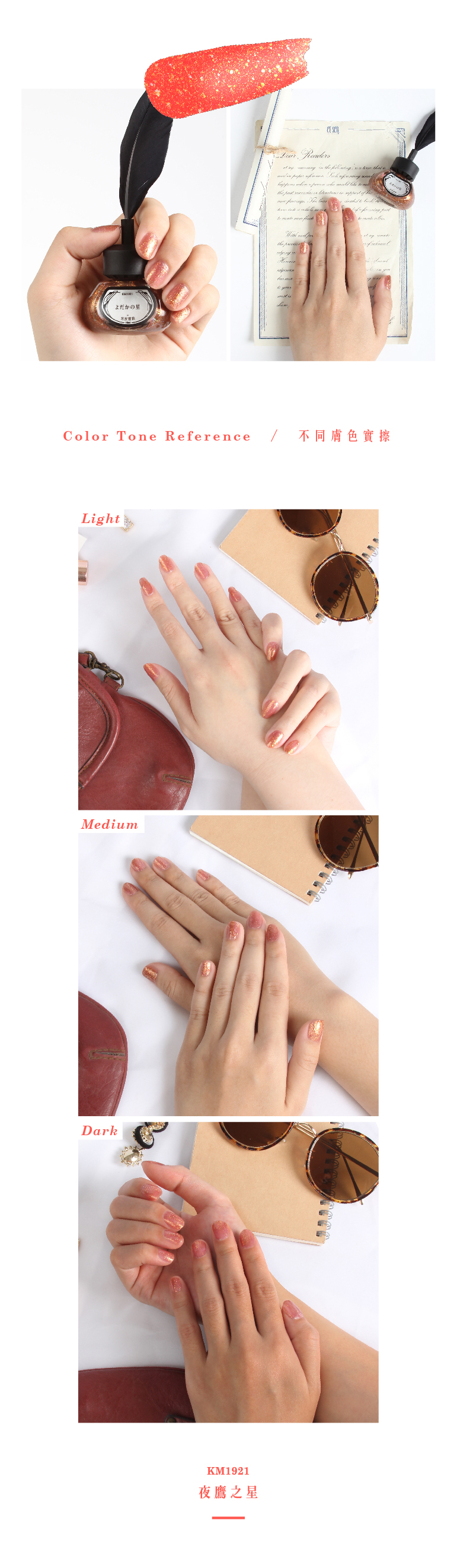 以燃燒為主題發想的指彩,亮片與亮粉的結合,像是呼應夜鷹最後形成的那顆星,在經過無止盡的燃燒以及痛苦後,最終找到了自己的歸屬。