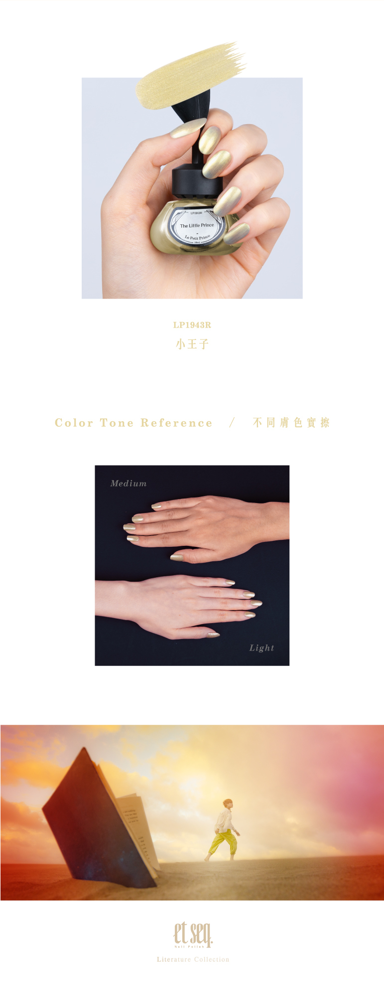 指彩透過流沙金表達出了多層象徵意涵。流沙的金色質地,呈現了沙漠的某種神祕感,那是飛行員與小王子相遇的起點,而金色的光芒則呼應小王子本身純潔珍貴的特質,如黃金隱沒於沙中,需用心才能發掘,流沙的概念則表達著某種流動的永恆價值,如小王子的存在雖然短暫,但所留下的智慧與啟示,卻永久留存。