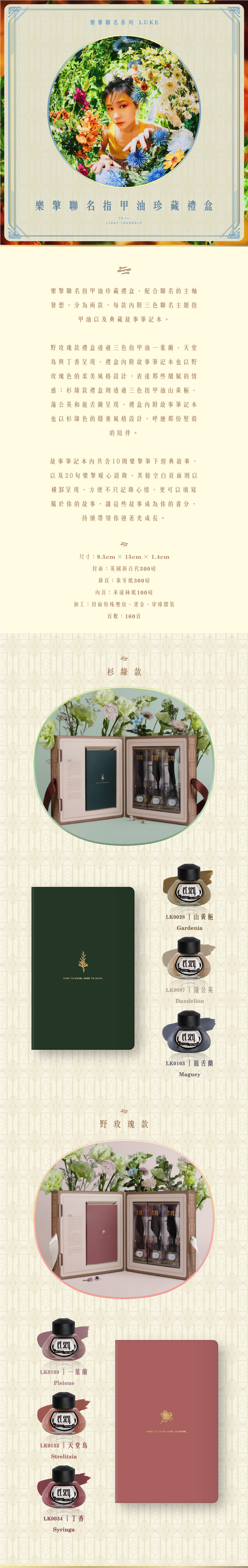 樂擎聯名指甲油珍藏禮盒,配合聯名的主軸發想,分為兩款,每款內附三色聯名主題指甲油以及典藏故事筆記本。