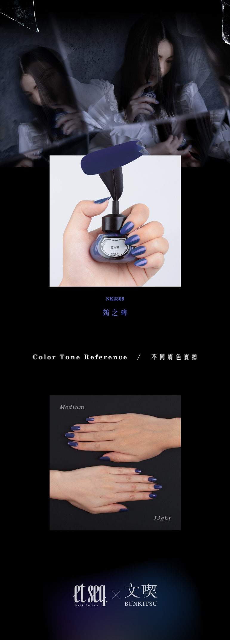 【瑠璃色】(るりいろ),【瑠璃】又稱為青金石,原本為佛教中心須彌山上的一顆明珠,被視為佛教七寶之一,是一種帶紫色色調的藍色,讓人聯想到平静但神祕的深海。