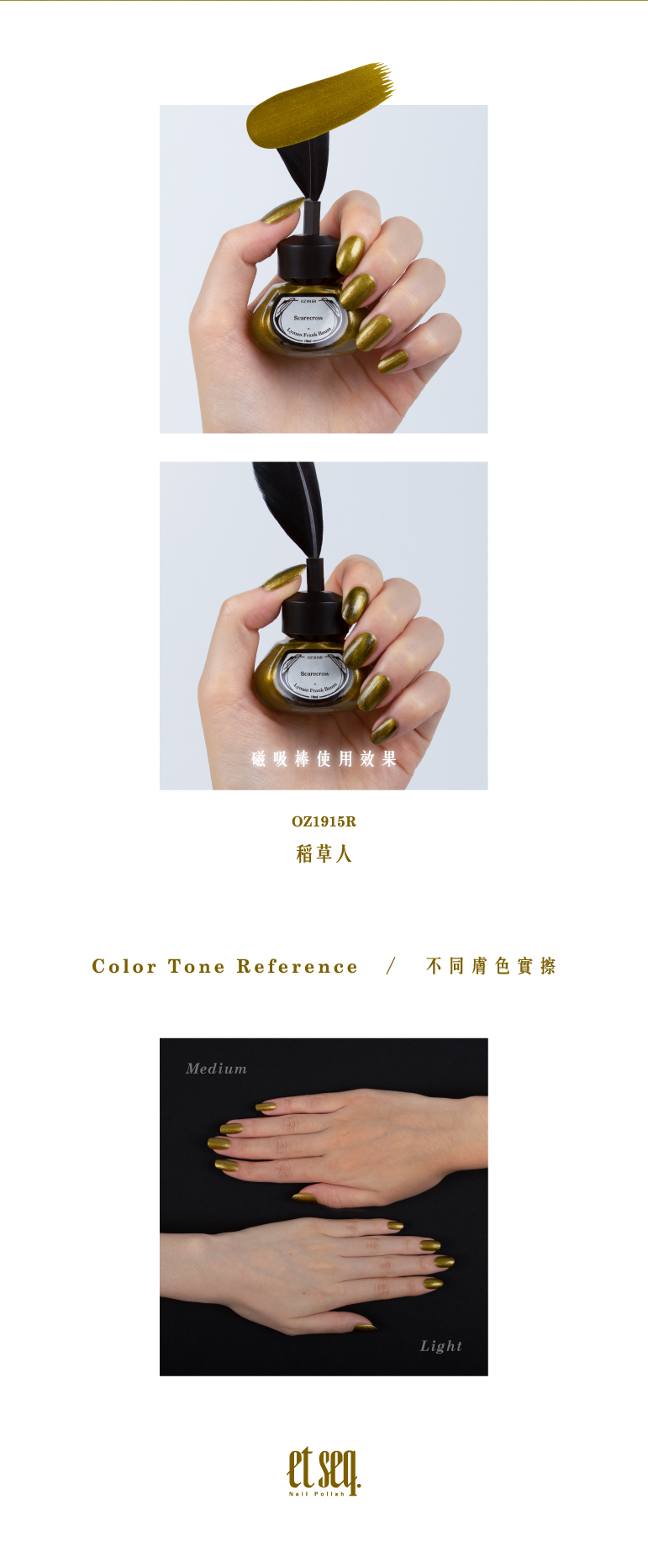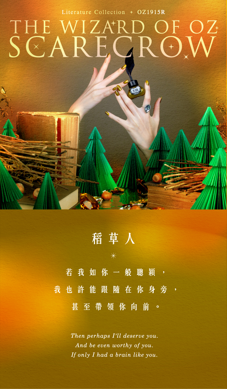 使用貓眼(磁吸)指彩,呈現出故事裡的奇幻氛圍,而稻穗黃的底色,則象徵著智慧與成長。稻穗黃不僅意涵著富饒,也暗示著稻草人的潛能,黃澄澄的意象,承載著其成長的可能性與對未來的無盡希望。