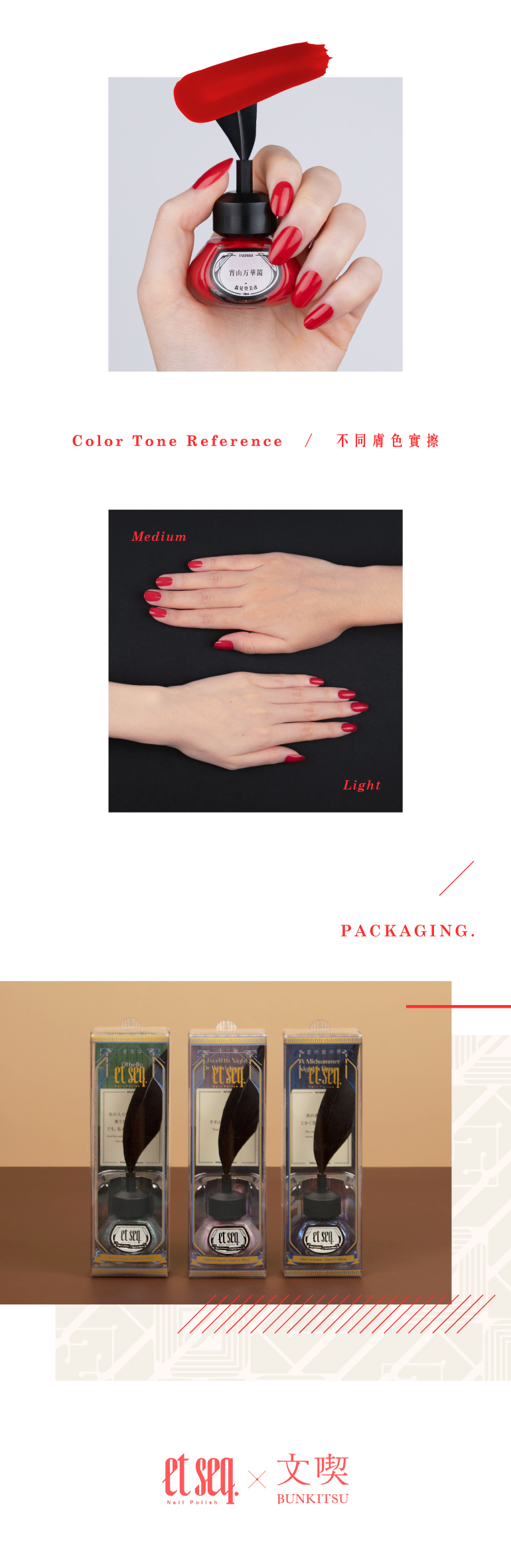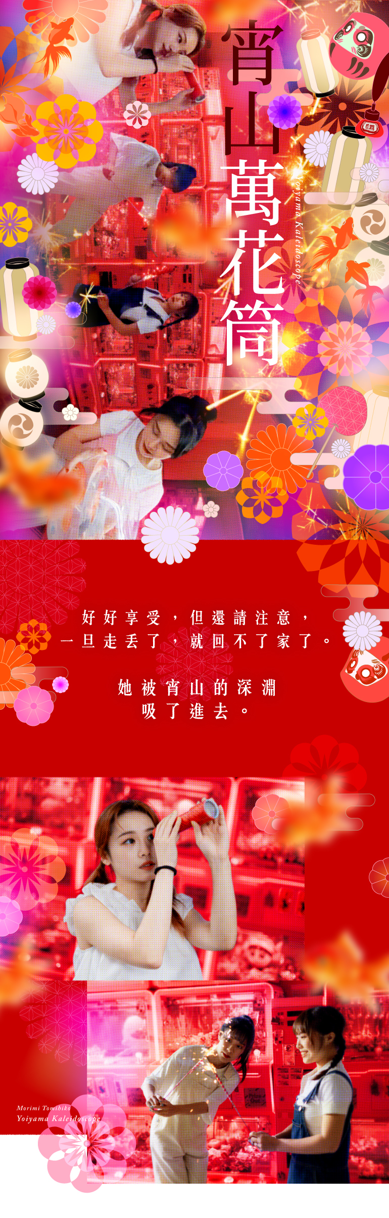 使用經典的京緋色來表達這場來自京都的華麗祭典,京緋色作為日本的傳統色因其純淨和鮮豔而被特別命名。那些迷失在宵山祭裡的人們,也都一度被京緋色的華麗所迷惑,如同那旋轉的萬花筒般。