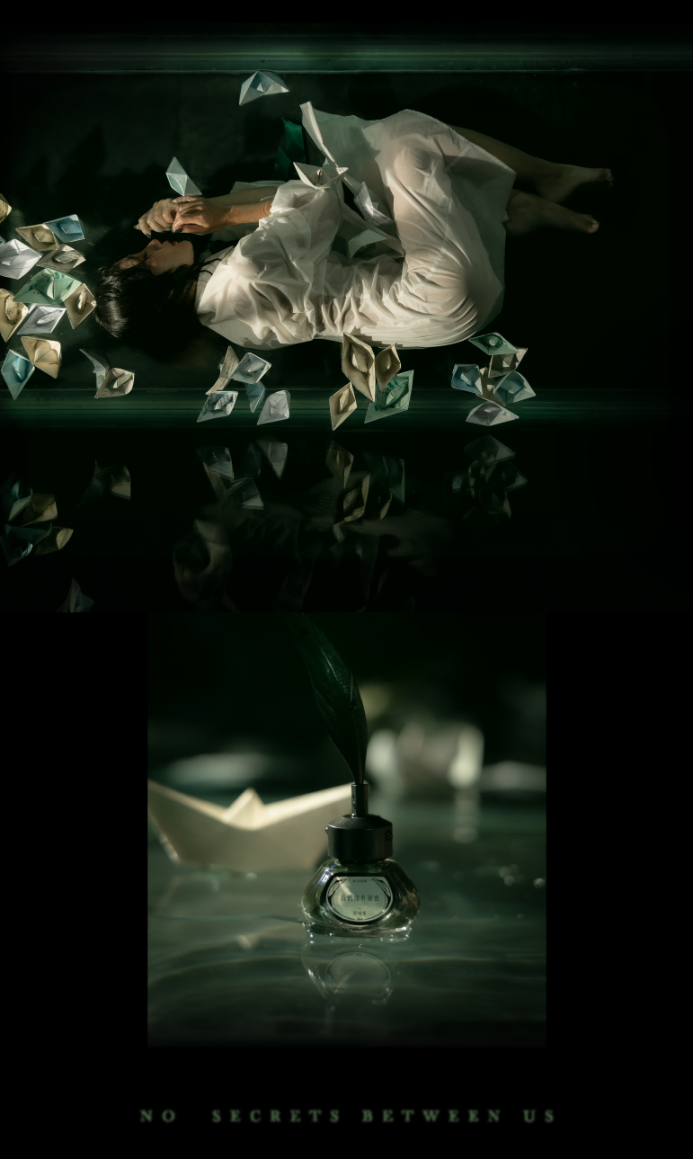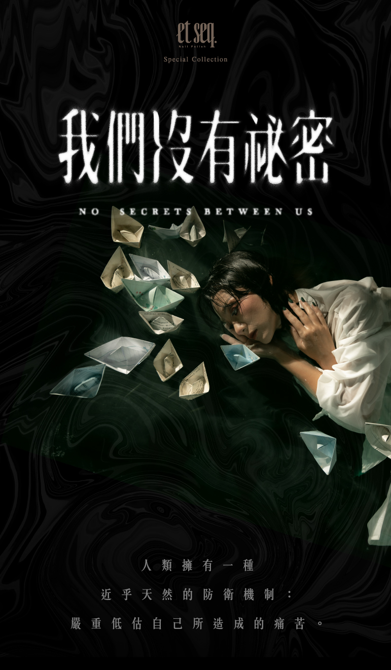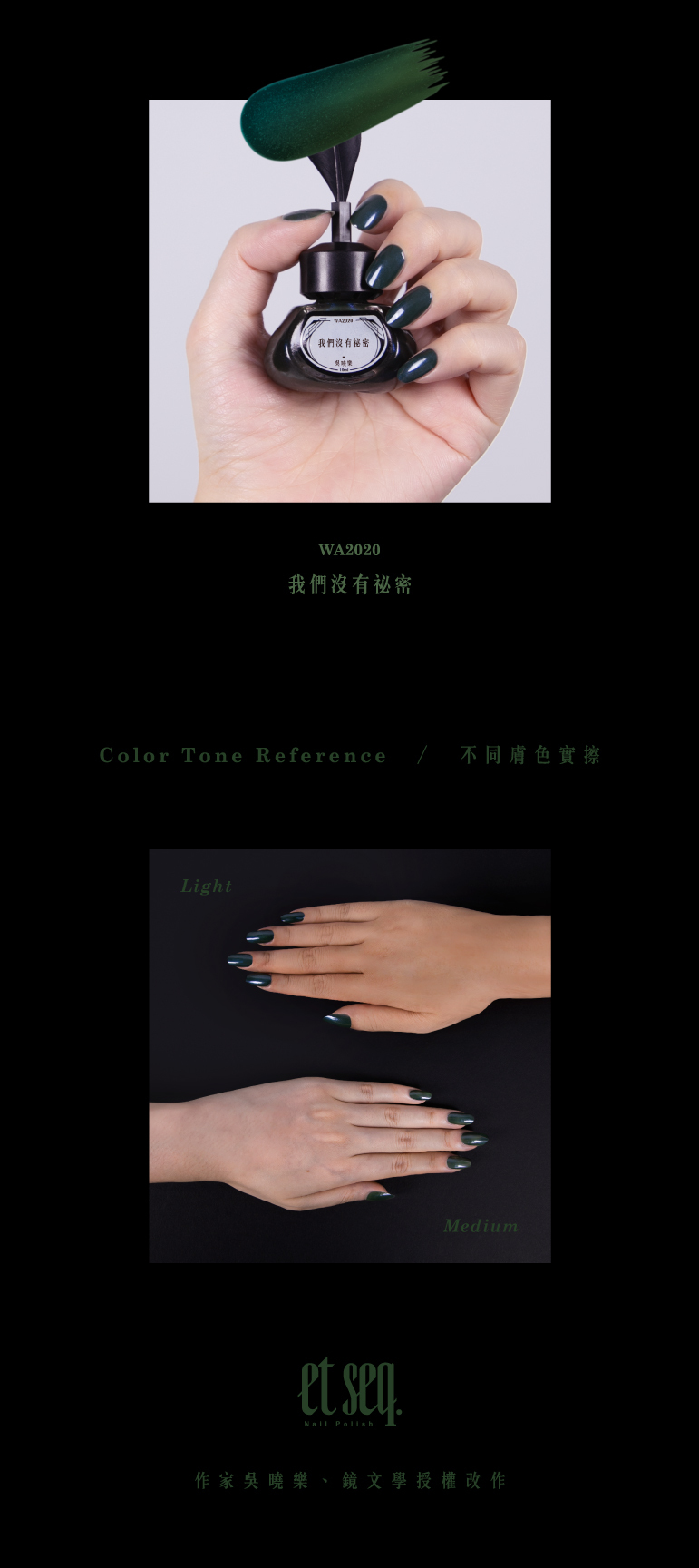 以遠古雨林裡滿佈著的長藤為基礎概念,透過藍偏光古藤綠色來表達【 秘密】 這個主軸。交錯遍布, 那種種的糾結如同那些纏繞在雨林深處的藤蔓, 而在那些藤蔓下可能存在的、 隱而未知的具具骸骨, 都是無從知曉的秘密。 隱隱的偏光藍, 則隱諱地帶出一股幽光, 那是某種秘密裡殘存下的悲傷, 細細點點滿佈在那些無從知曉的秘密裡。