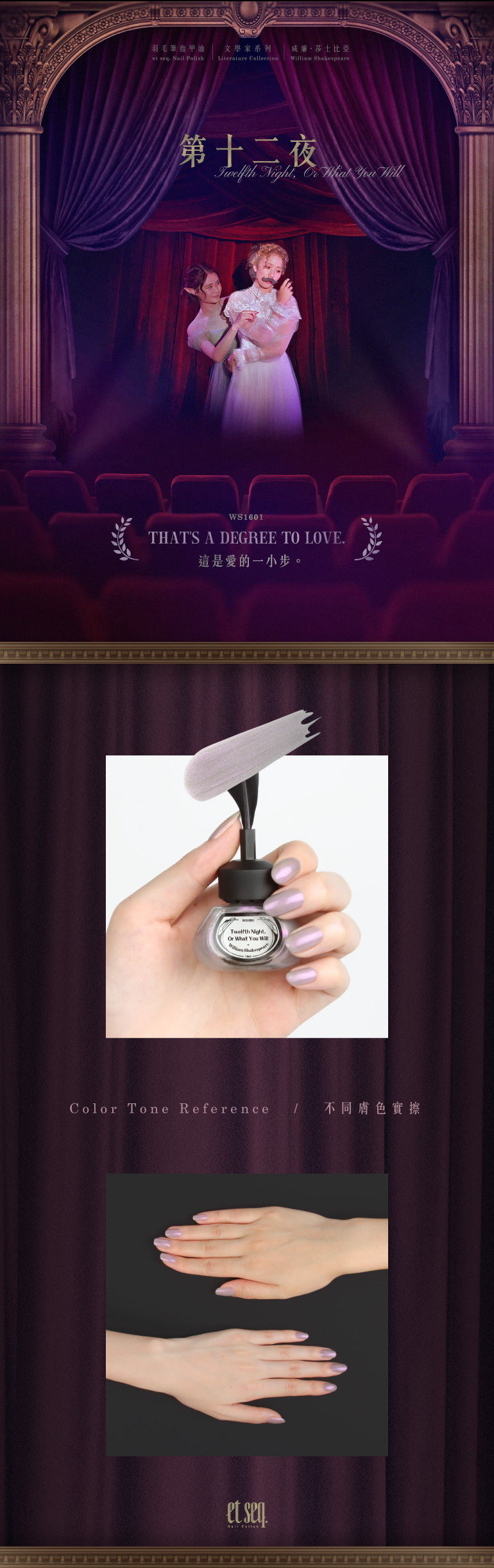 第十二夜 《第十二夜》又名《隨心所欲》(What you will), 被譽為莎士比亞眾劇裡最經典的喜劇。 愛情亂局顯現的離奇狂亂,讓此劇成為「史上最瘋狂、最幽默的愛情喜劇」。 描述一對雙胞胎兄妹在一次船難中分離,妹妹在女扮男裝的情況下, 發展出兩條愛的戀曲,最終真相大白並歡喜收場。 |